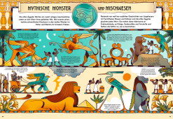 Mit diesem im witzigen Comicstil illustrierten Sachbuch reisen wir direkt in die Welt des Alten Ägyptens! Es versammelt die bekanntesten ägyptischen Mythen, Sagen und Legenden und gibt einen Überblick über tapfere Held:innen, erhabene Gottheiten, mächtige Pharaonen und fürchterliche Ungeheuer der ägyptischen Sagenwelt. Das Mythologie-Buch enthält Geschichten voller Liebe, Verlust, Gier, Neid und Tapferkeit und hat auch allgemeine Informationen zu den ägyptischen Mythen parat. So tauchen wir mir Horus, der sich in ein Nilpferd verwandelt, um die Wette, sind dabei, wie Osiris, der Gott der Toten, vom eigenen Bruder zerstückelt und als erste Mumie der Welt wieder zusammengesetzt wird, schauen uns den Schöpfungsmythos an und lernen im Buch der Gottes Thot die Sprache der Tiere.